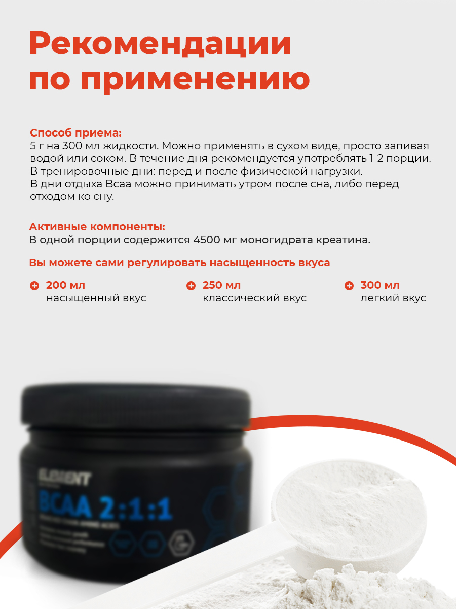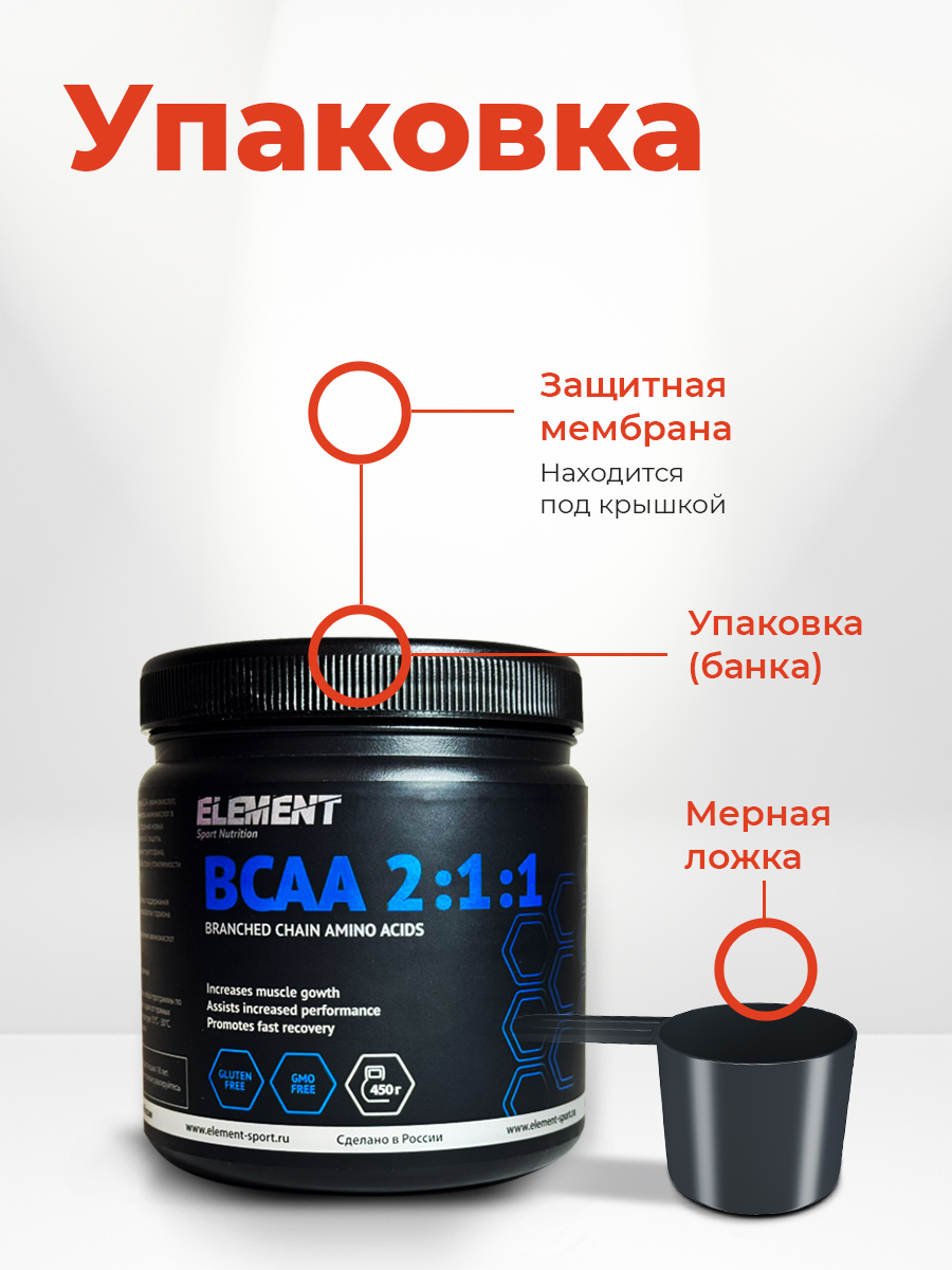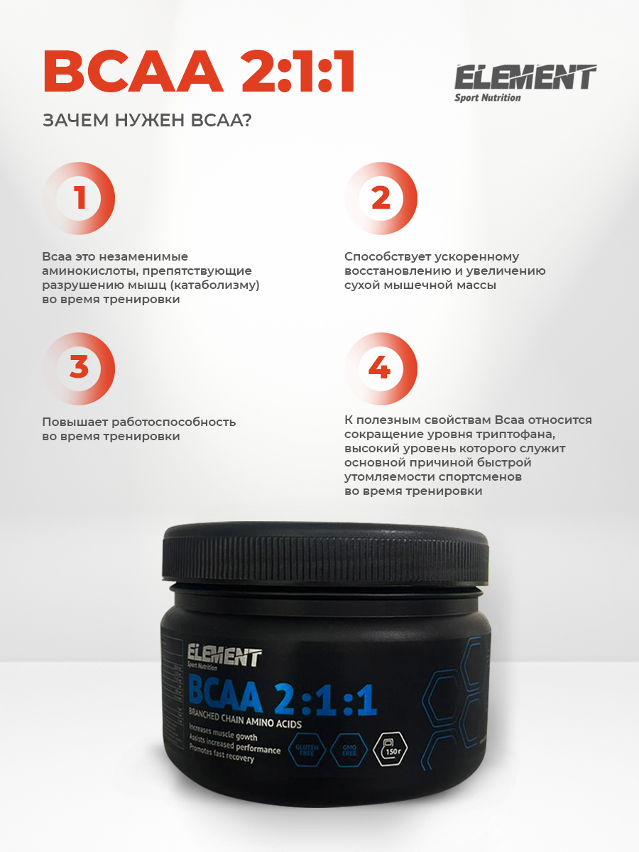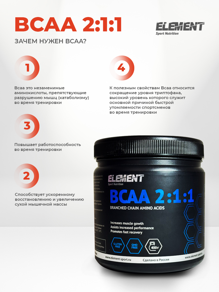 Формула Element BCAA построена на сочетании трёх ВСАА аминокислот, на долю которых приходится около трети общего количества аминокислот в мышцах. Им принадлежит ведущая роль в процессах построения новых мышечных волокон, их восстановления и антикатаболической защиты. К полезным свойствам ВСАА относится сокращение уровня триптофана, высокий уровень которого служит основой причиной быстрой утомляемости спортсмена во время тренировки. Дополнительно формула Element ВСАА обогащена: Глютамином - для оптимизации синтеза белков и гликогена, поддержания положительного азотистого баланса, стимулирования выработки гормона роста и иммунных клеток; Витамином В6 - для более быстрого и качественного усвоения аминокислот Element BCAA.