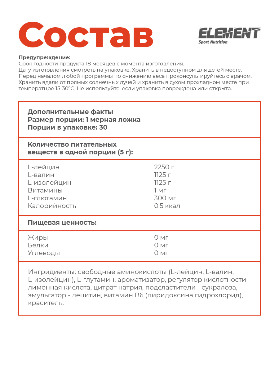 Формула Element BCAA построена на сочетании трёх ВСАА аминокислот, на долю которых приходится около трети общего количества аминокислот в мышцах. Им принадлежит ведущая роль в процессах построения новых мышечных волокон, их восстановления и антикатаболической защиты. К полезным свойствам ВСАА относится сокращение уровня триптофана, высокий уровень которого служит основой причиной быстрой утомляемости спортсмена во время тренировки. Дополнительно формула Element ВСАА обогащена: Глютамином - для оптимизации синтеза белков и гликогена, поддержания положительного азотистого баланса, стимулирования выработки гормона роста и иммунных клеток; Витамином В6 - для более быстрого и качественного усвоения аминокислот Element BCAA.