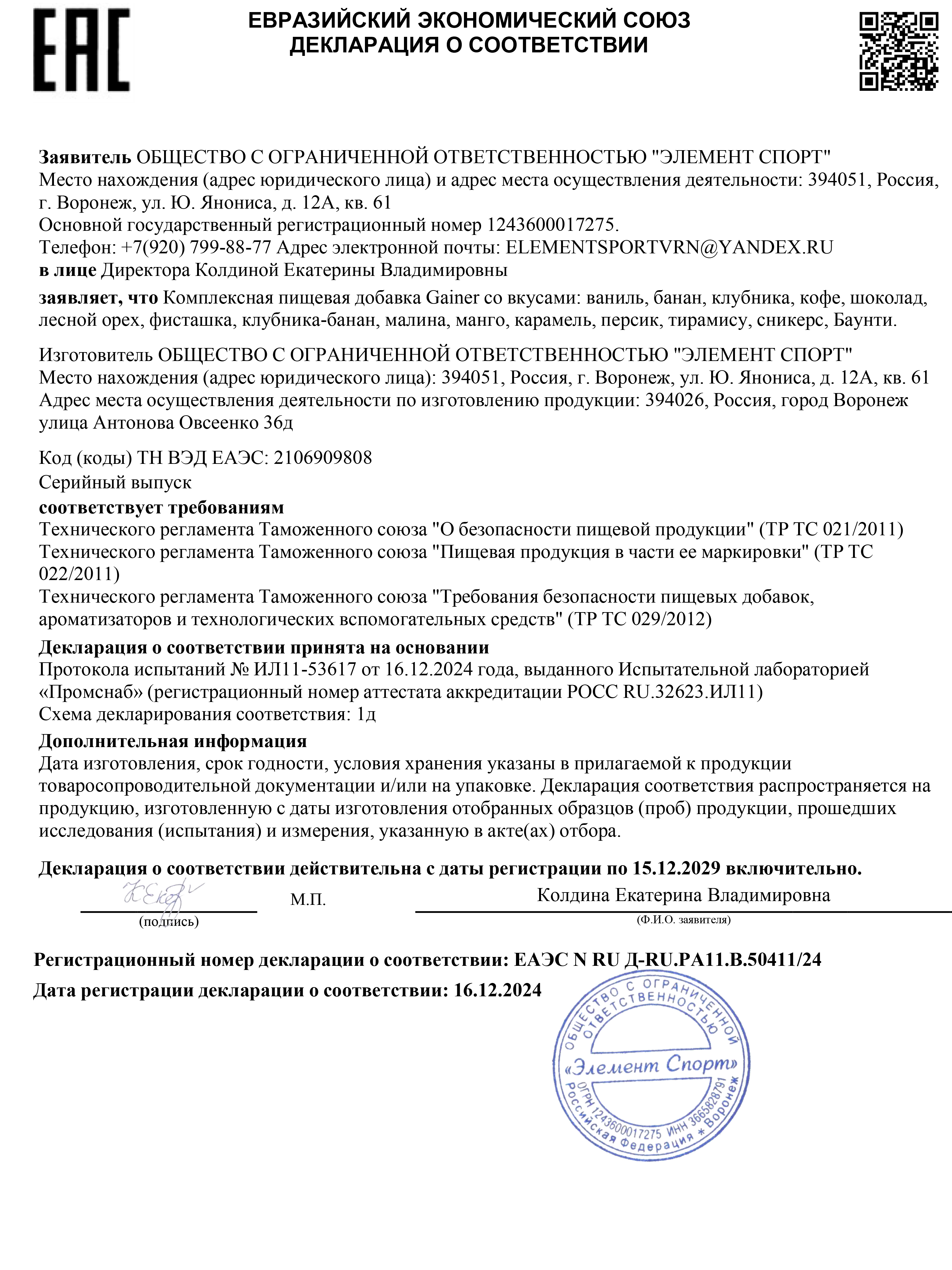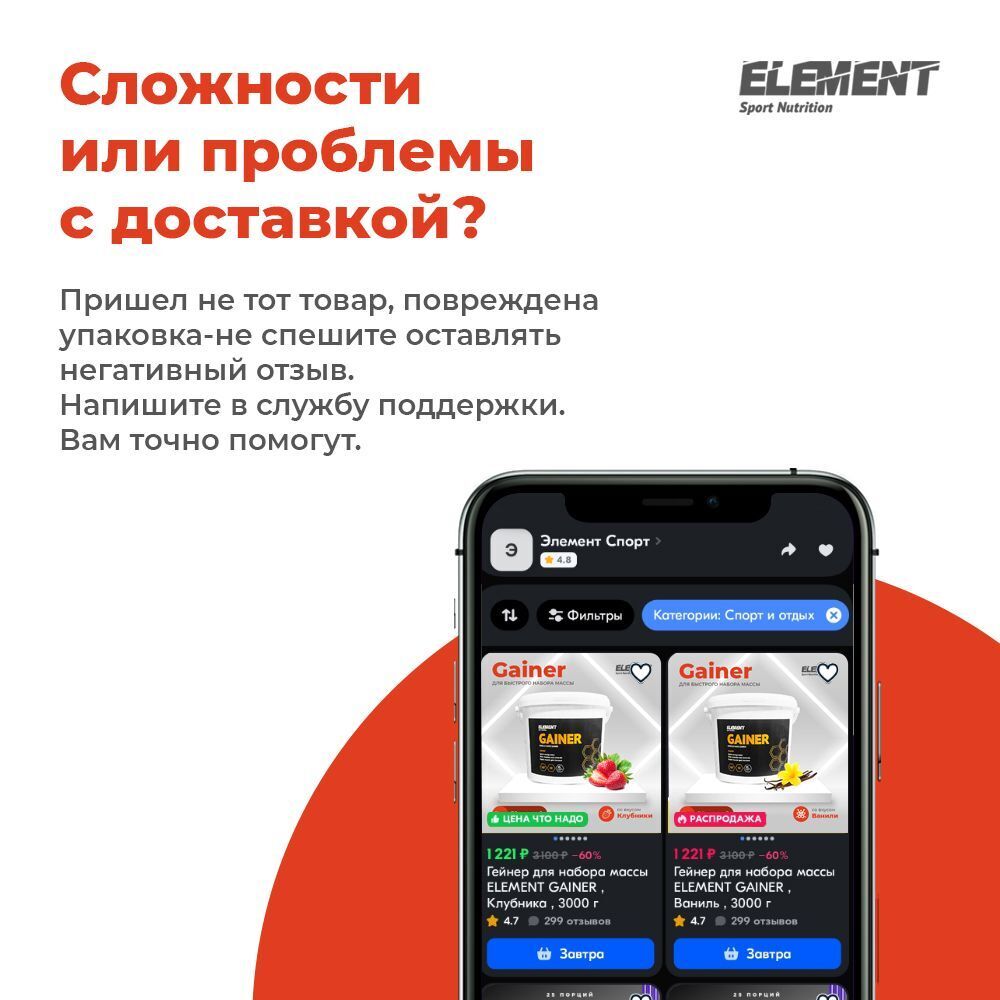 Гейнер для набора массы ELEMENT GAINER , Ваниль , 1000 г