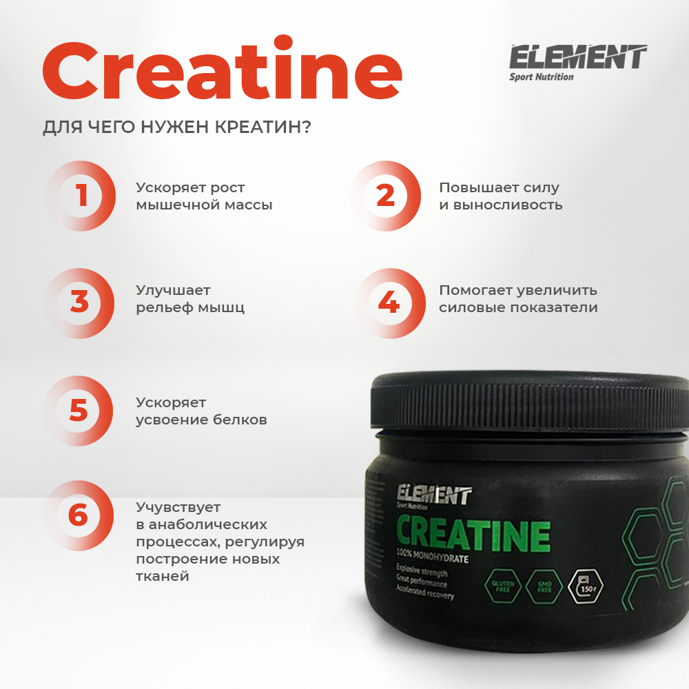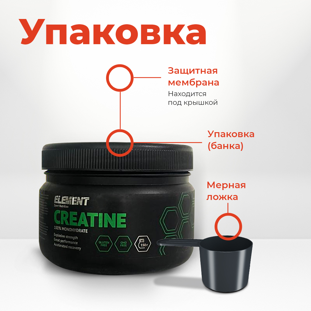 Основным действующим веществом Element Creatine является наиболее концентрированное соединение креатина – моногидрат креатина .